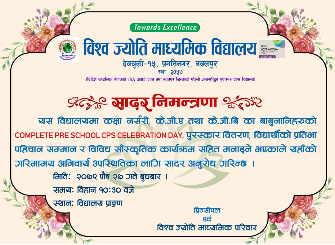 यस बिद्यालयमा कक्षा नर्सरी, के.जी.ए ता क.जी बि का बाबुनानिहरुको COMPLETE PRE SCHOOL(CPS) CELEBRATION DAY पुरस्कार वितरण, बिद्यार्थीको प्रतिभा पहिचान सम्मान र विविध सांस्कृतिक कार्यक्रम सहित मनाइने कार्यक्रम भएकाले यहाँको अनिवार्य गरिमामय उपस्थितिका लागि सादर अनुरोध गर्दछौं ।